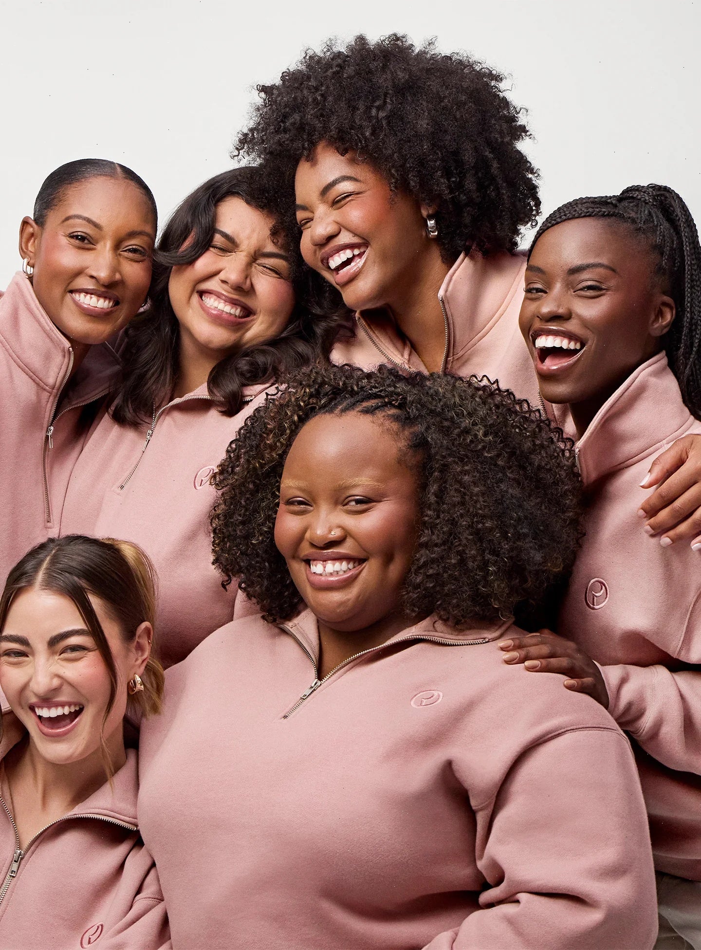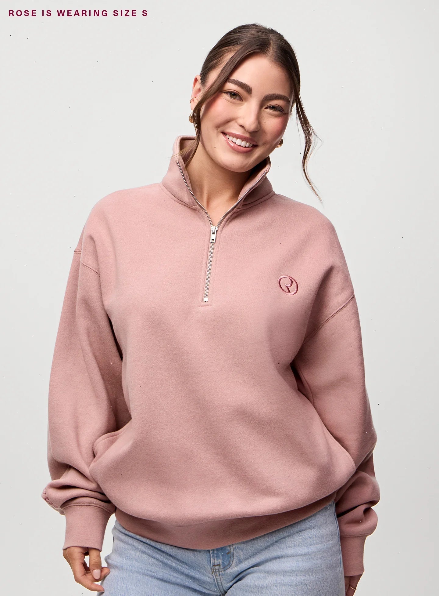 Universally flattering dusty rose colorway, topped with an embroidered monogram on the chest and Rare Beauty logo on the sleeve.